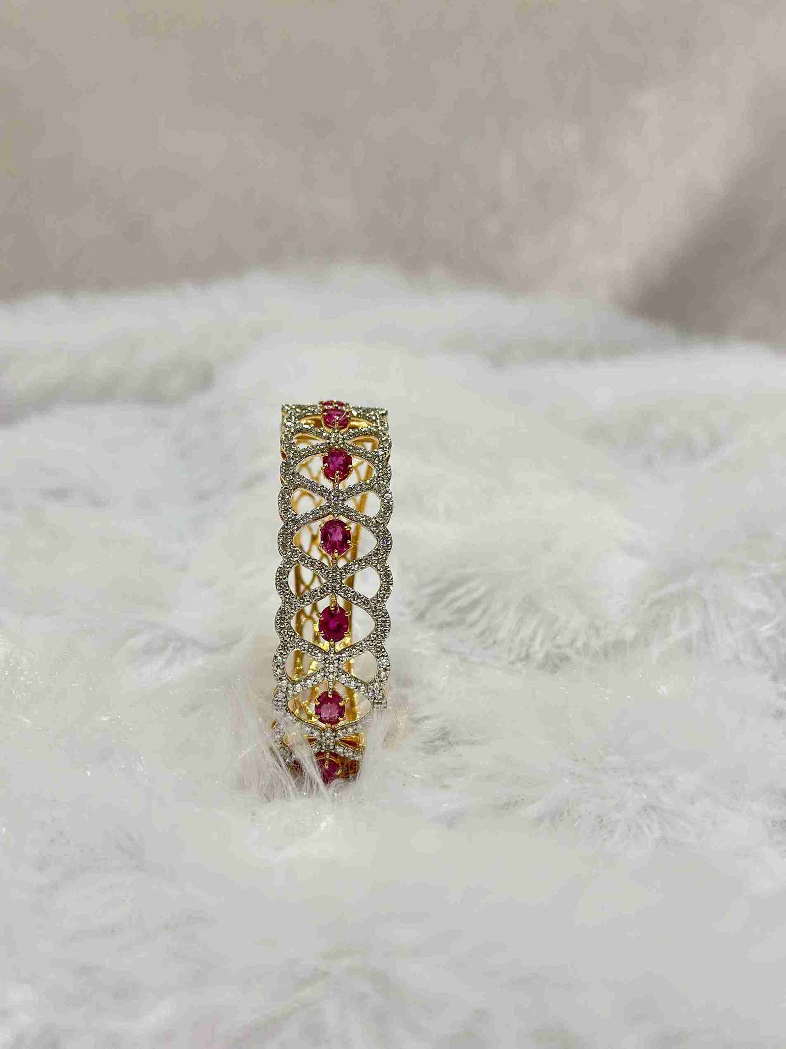 This ruby bracelet with diamonds surrounding the central ruby is a timeless and luxurious piece of jewelry that combines the rich color of rubies with the brilliance of diamonds