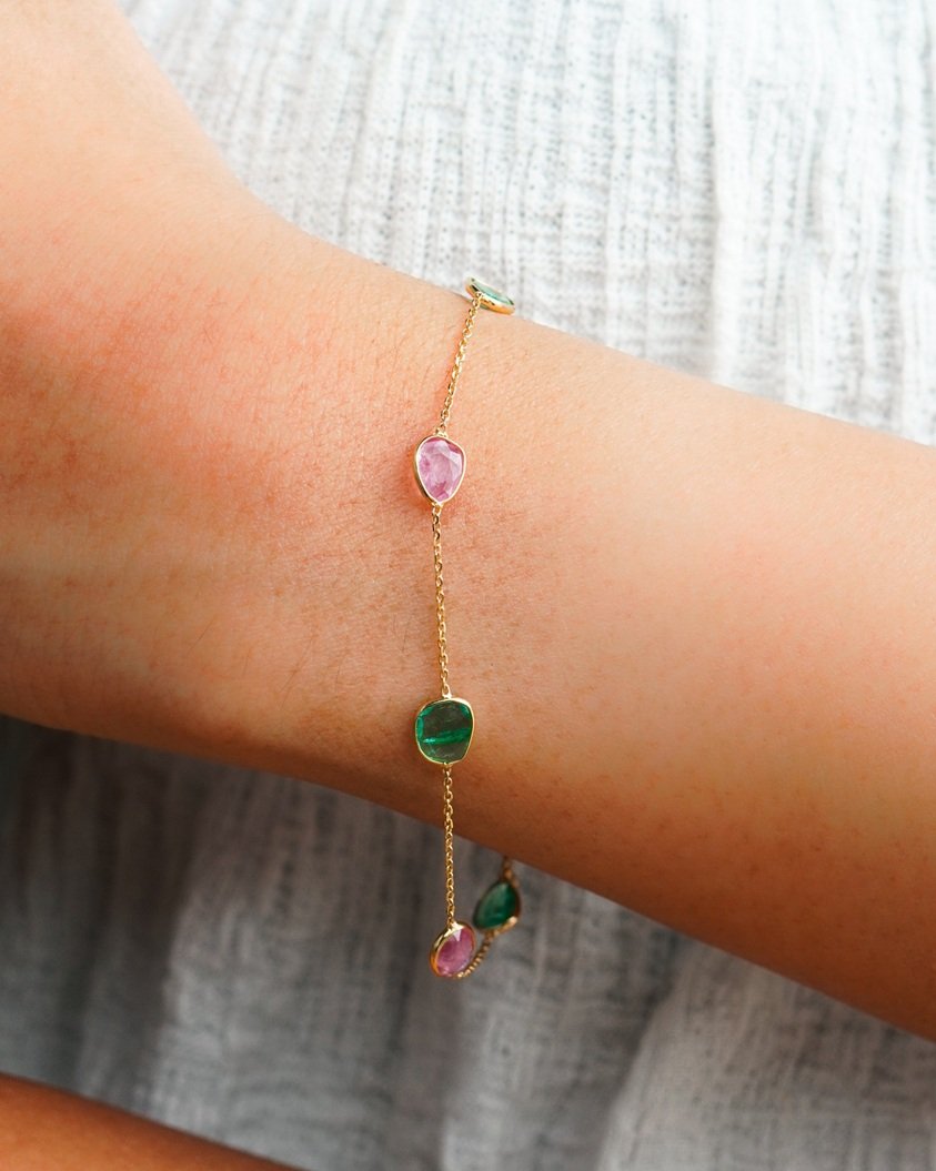 18kt Gold Emerald and Pink Sapphire Bracelet – A stunning fusion of vivid green and soft pink.