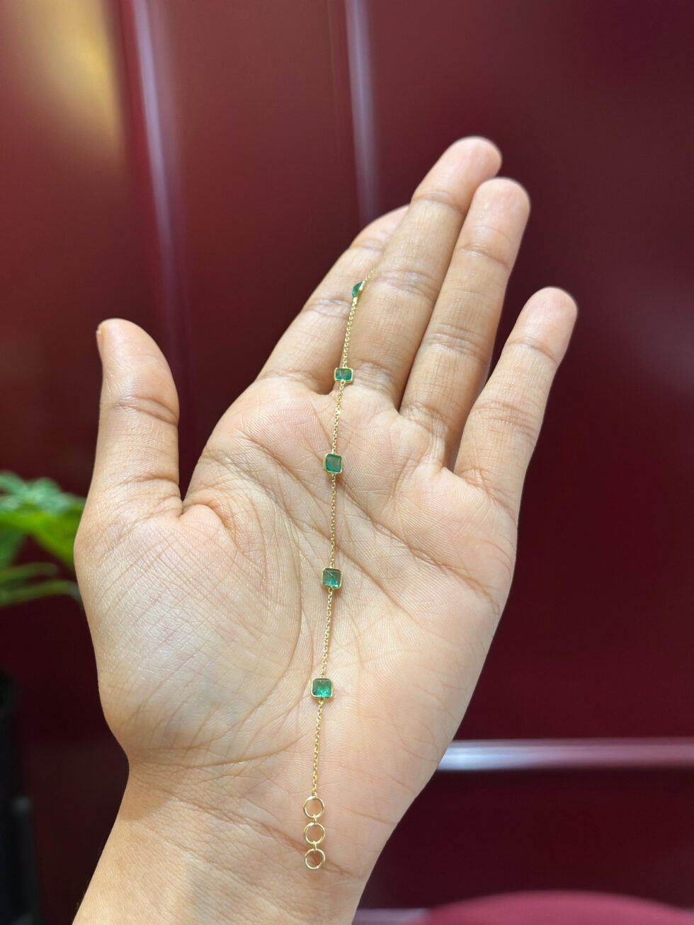 Delicate 18kt gold bracelet set with natural square emerald gemstones.Modern minimal, classy and extremely elegant on the wrist.Ideal for gifting, daily wear and luxury wardrobe elevation.