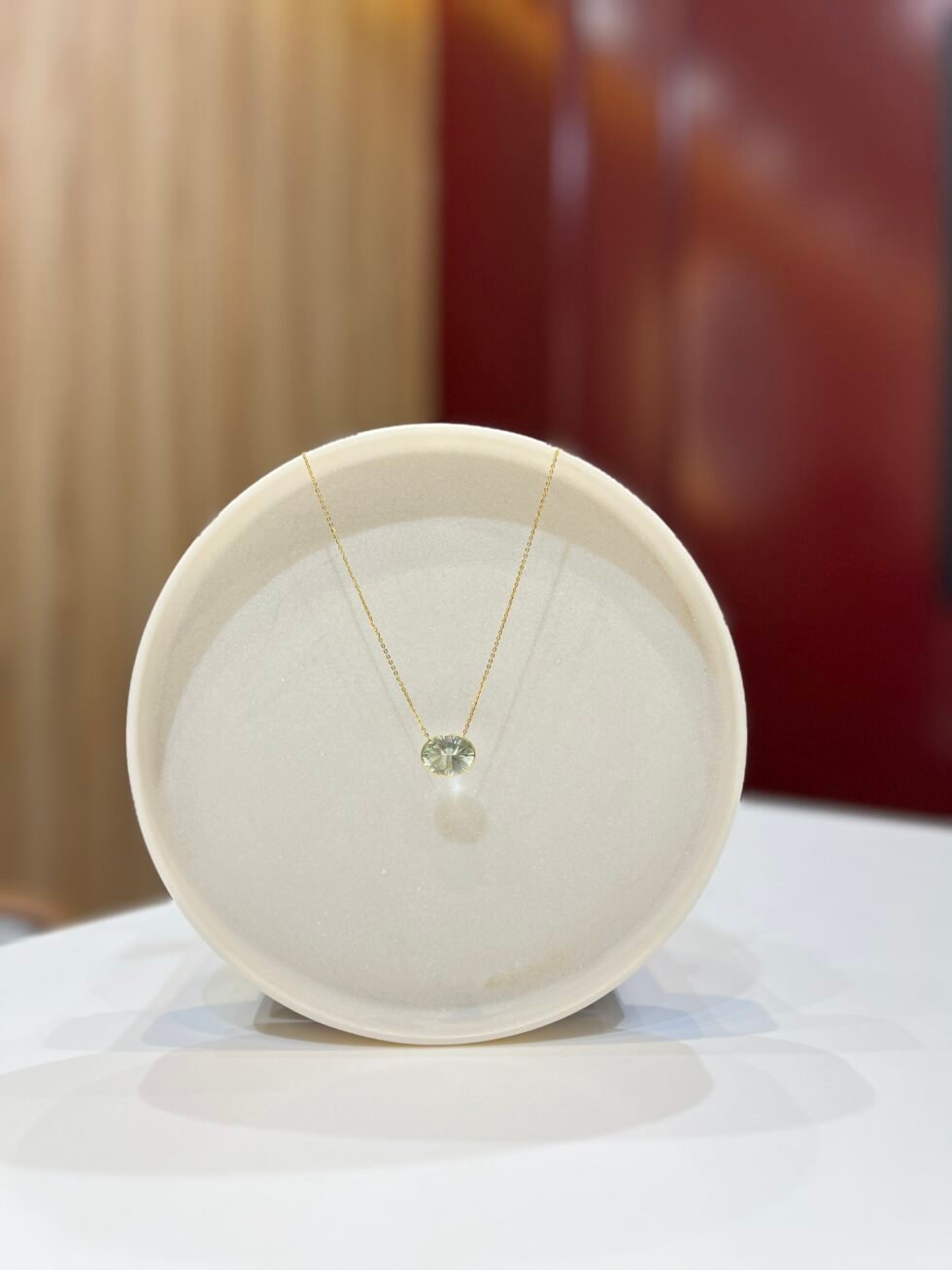 18kt Gold Natural Green Amethyst Necklace in a clean, minimal setting.