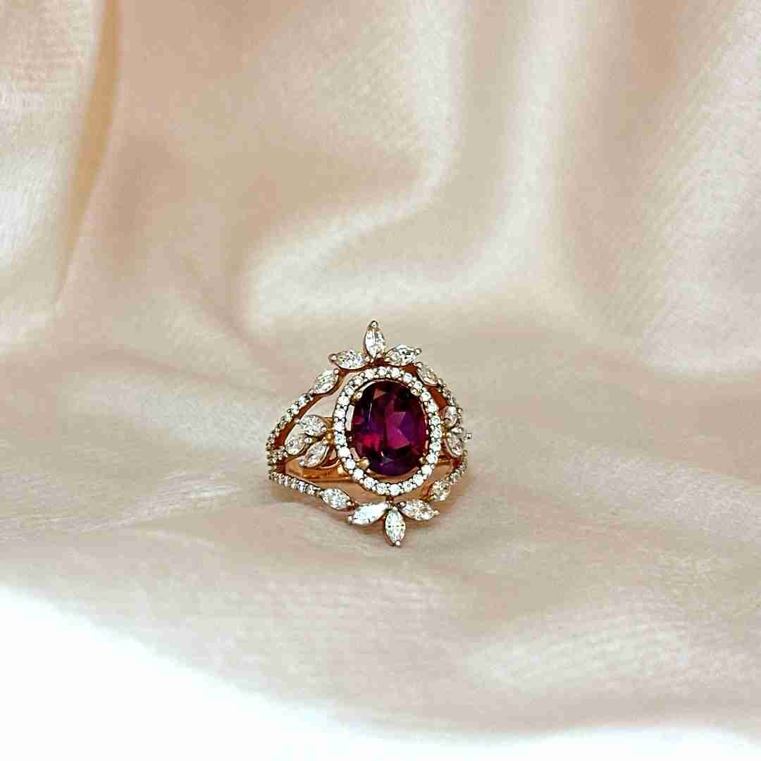 This purple garnet ring would make for a unique and vibrant piece of jewelry. Its prized for their deep, rich hues that range from rose to purplish-red, with some stones leaning more towards violet tones.
